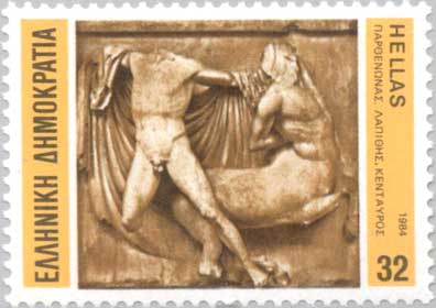 Lapith und Kentaur, Parthenon Der Parthenon war sowohl innen als außen mit aufwendiger marmorner Bildhauerei verziert. Diese sind nur zum Teil erhalten geblieben, jedoch gibt es ausführliche Beschreibungen der zerstörten Teile. Am Ostgiebel befand sich eine Darstellung der Geburt Athenes, der Westgiebel zeigte ihren Kampf mit Poseidon um den Besitz Attikas. Ein Fries lief oberhalb der Säulen um alle vier Seiten des Tempels. Auf diesem war an der Südseite die Schlacht zwischen Lapithen und Kentauren, an der Ostseite der Kampf der Götter gegen die Giganten und an der Westseite die Schlacht um Marathon (früher als Kampf zwischen Griechen und Amazonen gedeutet) zu sehen. Die Darstellung der Nordseite ist nicht überliefert, möglicherweise zeigte sie Szenen aus dem Trojanischen Krieg. Im Inneren, wurde die Cella an drei Seiten durch einen Fries begrenzt, der die große Prozession während der Panathenäen, das größte jährlich stattfindende Fest zu Ehren der Athene zeigte. Auf der vierten, der östlichen Seite befand sich ein Fries mit der Darstellung sämtliche Götter des griechischen Pantheons. Obwohl der bloße, weiße Marmor der erhaltenen altertümlichen griechischen Tempel der heutigen Ästhetik entspricht, war der Parthenon zumindest stellenweise bemalt. In wie weit und in welchen Farben ist bis heute allerdings unter Wissenschaftlern umstritten. Es ist bekannt, dass die Decken im Innern in einem dunklen Blau gehalten waren, während die Abbildungen in den Giebeln helle Farbtöne trugen. Einige Wissenschaftler haben die These aufgestellt, dass der Parthenon im oberen Teil in einem hellen Blau und Rot bemalt war, so dass die Skulpturen beim Anblick von unten deutlicher hervortraten. Weitere Geschichte Der Parthenon blieb als wichtigster Tempel der Religion des antiken Griechenlands mehr als tausend Jahre lang erhalten. Es gilt als erwiesen, dass er noch im vierten nachchristlichem Jahrhundert vollständig erhalten war (zu diesem Zeitpunkt war er ungefähr so alt wie beispielsweise Notre-Dame heute und wesentlich älter als der Petersdom). Allerdings war zu diesem Zeitpunkt Athen nur noch Provinzstadt im römischen Reich, freilich eine mit großer Vergangenheit. Irgendwann im fünften Jahrhundert wurde das Standbild der Athene von einem der römischen Kaiser nach Konstantinopel gebracht, wo sie später verloren ging, womöglich während der Plünderung der Stadt beim vierten Kreuzzug 1204. Nach der Christianisierung wurde das Parthenon als christliche Kirche genutzt, in byzantinischer wie zur Zeit des römisch-katholischen Gegenreichs geweiht der Mutter Gottes. Die Umwandlung in eine Kirche ging einher mit der Beseitigung der inneren Säulen und einiger Wände der Cella sowie der Errichtung einer Apsis. Dieser fielen einige der Skulpturen zum Opfer, diejenigen die heidnische Götter zeigten wurden möglicherweise absichtlich zerstört, andere tauchten teilweise andernorts wieder auf. Als 1456 Athen unter osmanische Herrschaft gelangte wurde aus dem Parthenon eine Moschee. Entgegen der langläufigen Meinung respektierten die Osmanen im Allgemeinen die antiken Denkmäler und haben niemals böswillig Bauten zerstört. Allerdings gab es auch keine besonderen Bemühungen sie zu erhalten und in Kriegszeiten waren sie bereit diese zu beschädigen um aus den Steinen Baumaterial für Mauern und Befestigungen zu machen. Als einzige Modifikation wurde dem Parthenon ein Minarett hinzugefügt, europäische Reisende des 17. Jahrhunderts berichteten, dass das Gebäude ansonsten unversehrt war. Im Jahr 1678 wurde das Parthenon dann schwer beschädigt als die Venezianer Athen angriffen und die Osmanen die Akropolis befestigten und dabei das Parthenon als Pulverkammer benutzten. Ein Deutscher Offizier unter der Leitung von Wilhelm von Königsmark (1639-1688) zerstörte den Parthenon als eine Kanonenkugel die Kammer am 26. September 1987 traff, worauf die Munition explodierte. Der Innenaufbau war beschädigt, die übrig gebliebenen Teile des Dachstuhls brachen ein und einige Säulen, insbesondere an der Südseite, standen frei. Infolgedessen wurden auch die Bildhauereien beschädigt, viele fielen um und zerbrachen, die Scherben wurden später als Souvenirs verkauft. Nach der Explosion wurde das Gebäude nicht mehr benutzt. Wiederentdeckung