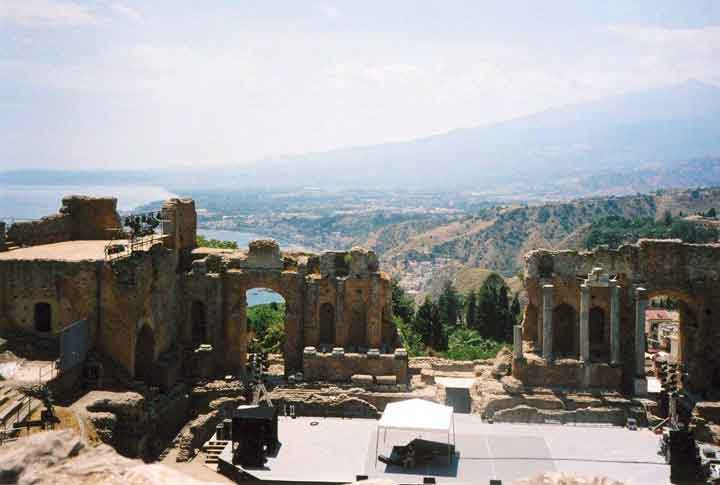 Lage und Daten Taormina hat 10.400 Einwohner (Stand 2000), diese leben auf einer Fläche von 13,2 km². Die Stadt liegt nordöstlich des Ätna auf einer Terrasse des Monte Tauro, 200 bis 300 Meter über dem Meeresspiegel. Haupterwerbszweig in Taormina ist der Tourismus. Die Nachbargemeinden sind: Calatabiano, Castelmola, Castiglione di Sicilia, Gaggi, Giardini-Naxos und Letojanni.